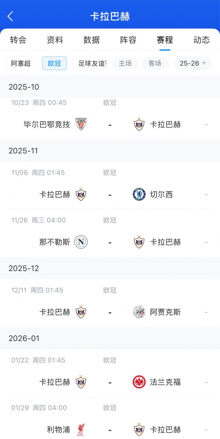 卡拉巴赫接下来欧冠还将面对切尔西、那不勒斯、利物浦等多队↓